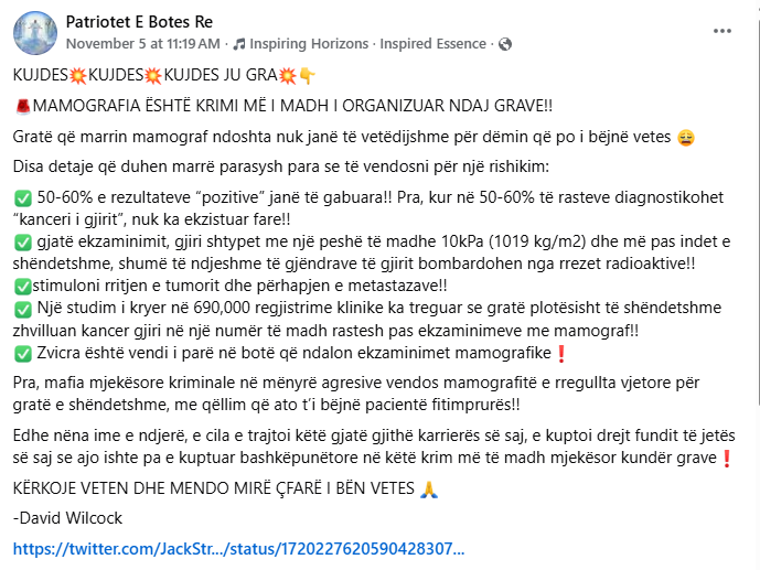 Postimi paralajmëron gjithashtu kundër kompresimit të gjirit dhe pretendon se “indet shumë të ndjeshme të gjirit bombardohen nga rrezet radioaktive!!”