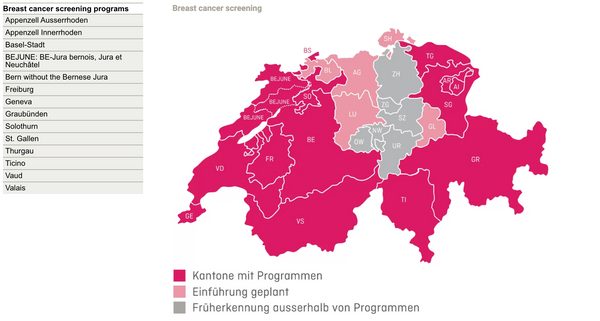 Zvicra, deri në momentin e shkrimit të këtij artikulli, ofron shërbime sistemike të mamografisë në shumicën e kantoneve në të gjithë vendin, siç tregohet nga një hartë në faqen e internetit të Shoqatës Zvicerane të Zbulimit të Kancerit. Kantonet që nuk ofrojnë shërbime sistemike të mamografisë ose i përmbahen një programi “me referim” ose planifikojnë të prezantojnë programe sistemike të zbulimit në të ardhmen. Një përditësim njofton se faqja e internetit është modifikuar për herë të fundit në fillim të shtatorit 2025.