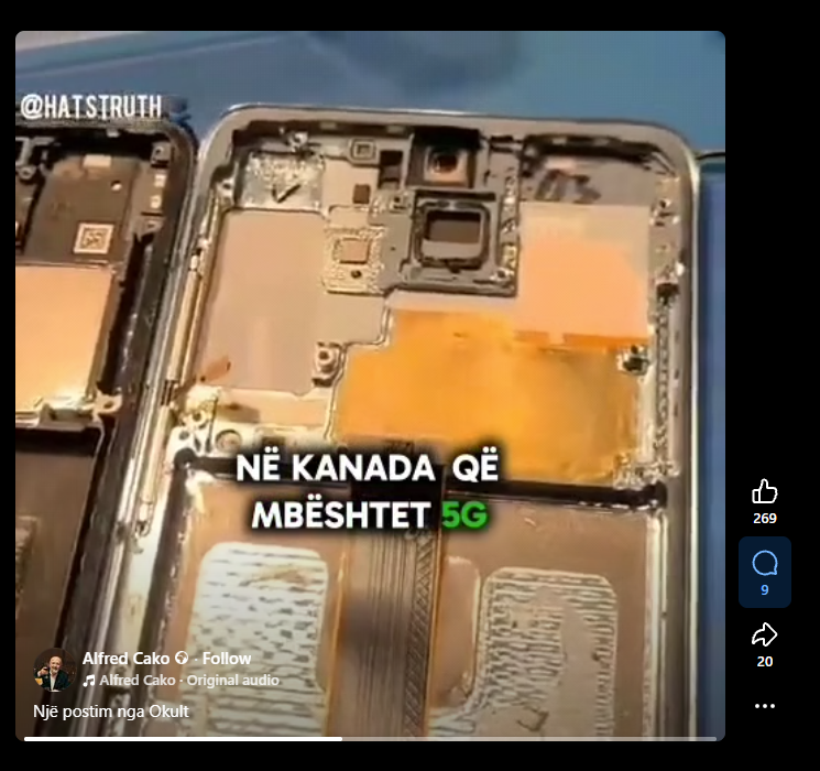 “Nuk ka asnjë telefon të vetëm në Kanada që mbështet 5G,” thotë folësi në video. “Nuk ka asnjë operator të vetëm në Kanada që mbështet 5G.” Folësi nuk është i dukshëm, por thotë: “Unë rregulloj telefona çdo ditë.” Klipi tregon dy telefona të çmontuar me vende bosh ku supozohet se duhet të ndodheshin antenat marrëse të 5G.