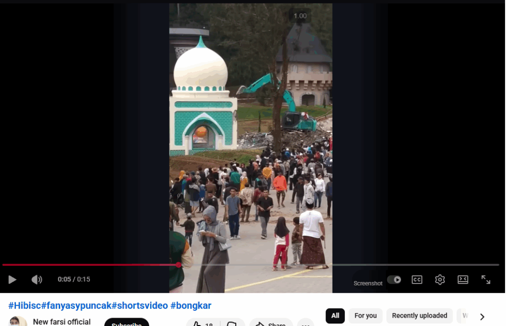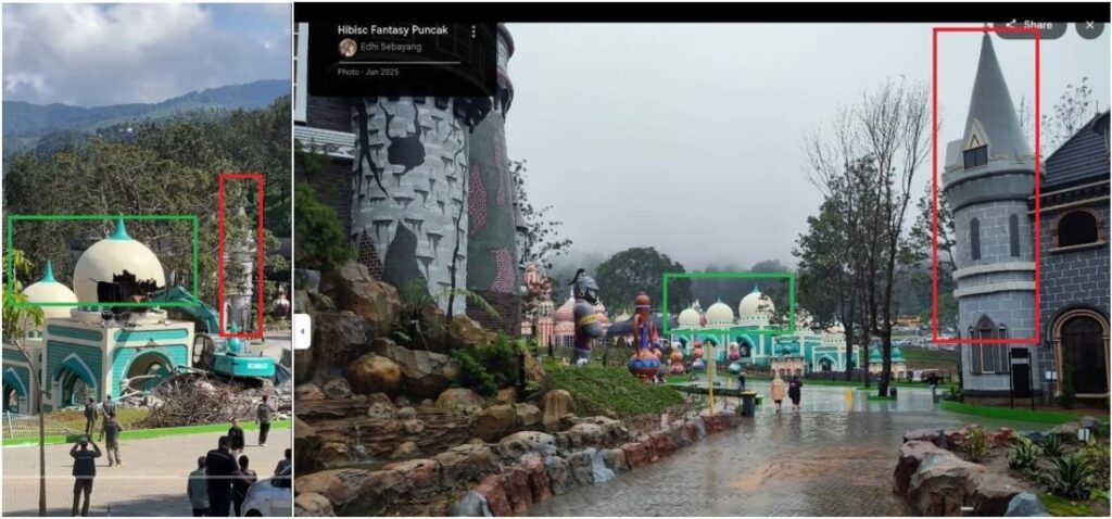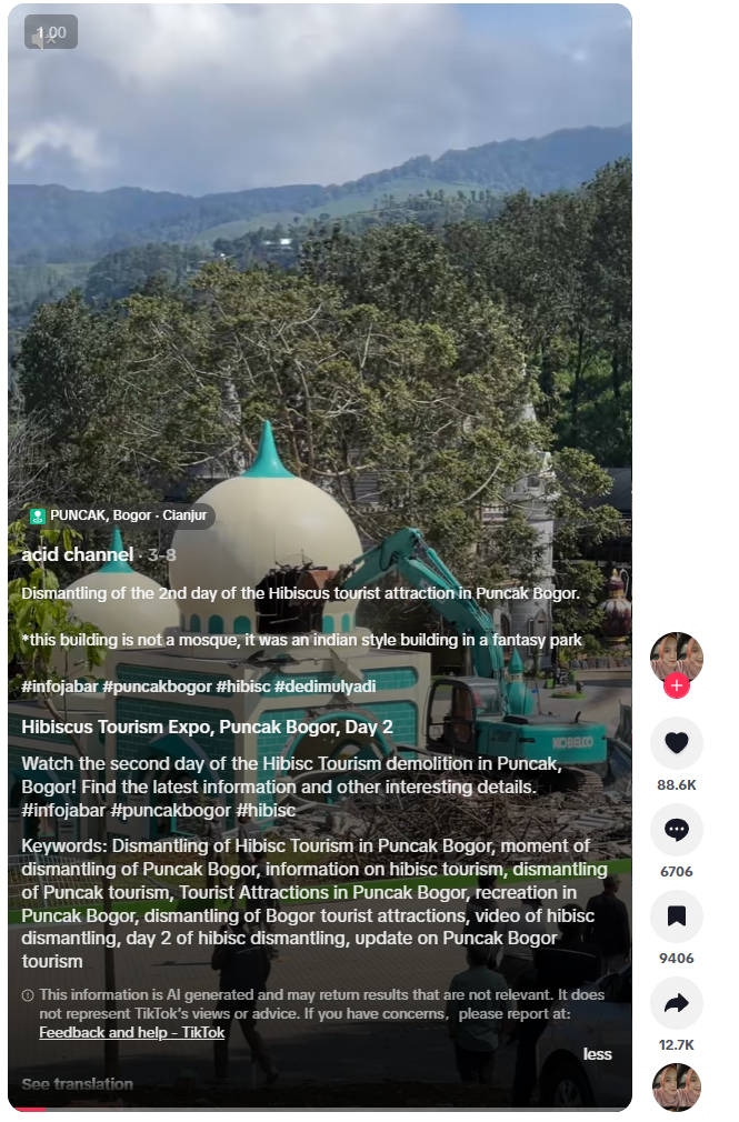 Mbishkrimi në gjuhën indoneziane thotë: “Dita e dytë e çmontimit të atraksionit turistik Hibisc në Puncak Bogor”. Mbishkrimi përfshin gjithashtu një deklaratë në anglisht ku thuhet se ndërtesa është një “ndërtesë në stilin indian në një park,” jo një xhami.