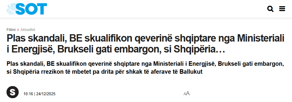 Në 23 dhjetor 2025, mediat shqipfolëse (link, link, link, link) raportuan se Bashkimi Evropian skualifikoi Shqipërinë nga Ministeriali i Komunitetit të Energjisë. Si arsye për këtë masë penalizuese këto lajme përmendin skandalet e ministres së Infrastrukturës dhe Energjisë Belinda Balluku si dhe projektin për ndërtimin e një TEC në Roskovec apo marrëveshjen për prodhimin e energjisë nga TEC-e lundruese të ankoruara në Vlorë.