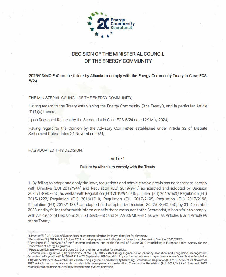 Në vendim konstatohet mosrespektimi nga ana e Shqipërisë i detyrimeve të lindura nga 31 dhjetori 2023, si pjesë e Traktatit të Komunitetit të Energjisë, duke mos adoptuar dhe aplikuar një sërë direktivash lidhur me rregullat e përbashkëta për tregun e brendshëm të elektricitetit, përgatitjen për emergjenca në sektorin elektrik, dhe hartimin e një numër udhëzuesish.