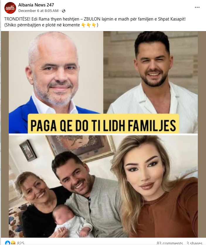 Kështu, një postim që ka marrë mbi 800 pëlqime në Facebook, pretendon se kryeministri shqiptar Edi Rama ka zbuluar një lajm të madh për familjen e Kasapit, ndërsa i fton lexuesit të klikojnë një lidhje në komente për të mësuar më shumë.