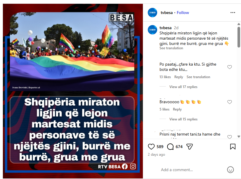 Një postim që ka marrë mbi 500 pëlqime dhe 600 komente në Instagram pretendon se Shqipëria ka miratuar “ligjin që lejon martesat midis personave të së njëjtës gjini.”