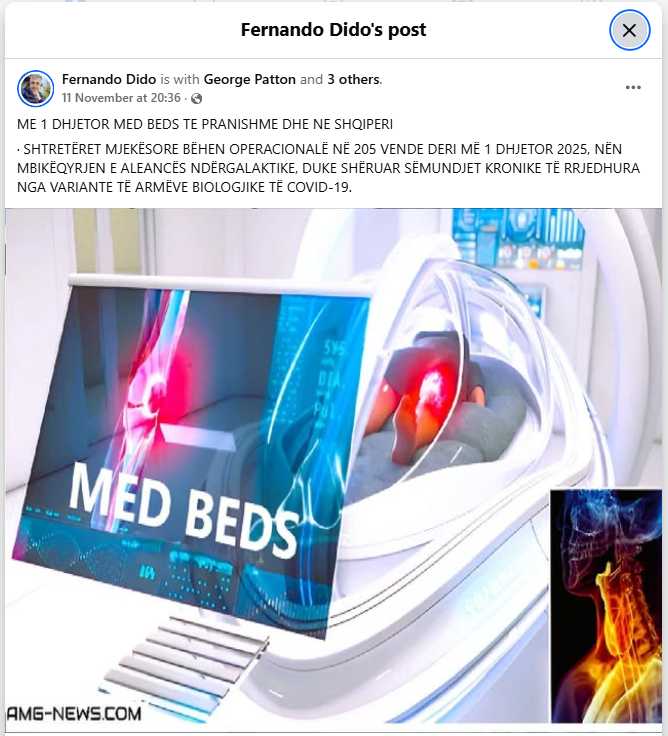 Një postim në Facebook pretendon se më 1 dhjetor në Shqipëri do të vendosen në funksion pajisjet e quajtura “med beds”, të afta të shërojnë sëmundjet kronike që “shkaktojnë variantet e armëve biologjike të COVID-19”. Në përshkrim përmendet edhe se teknologjia “po shpërndahet nëpër botë nga aleanca ndërgalaktike”.