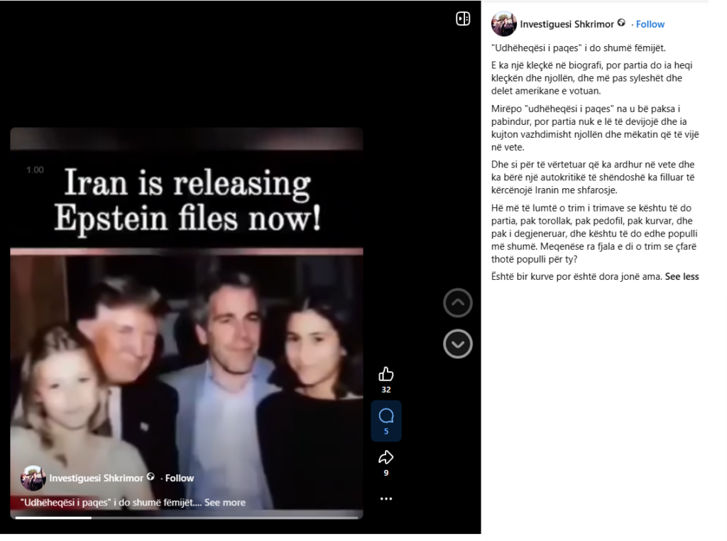 Në rrjete sociale, përfshi ato shqipfolëse, po qarkullojnë disa imazhe që duket se tregojnë presidentin amerikan Donald Trump dhe pedotrafikantin Jeffrey Epstein me një numër vajzash të mitura, shoqëruar me pretendimin se fotot ishin pjesë e dosjeve Epstein dhe ishin bërë publike nga Irani si hakmarrje ndaj kërcënimeve të Trump.