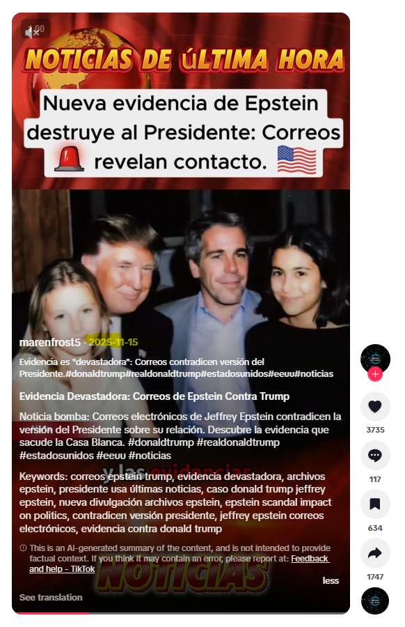 Më tej, video në TikTok u botua disa ditë para se Kongresi amerikan të miratonte Aktin për Transparencë të Dosjeve Epstein më 19 nëntor 2025. Departamenti i Drejtësisë publikoi një numër të vogël dosjesh në shkurt 2025, por publikimi i parë i madh filloi më 19 dhjetor 2025, duke vazhduar deri më 23 dhjetor 2025.