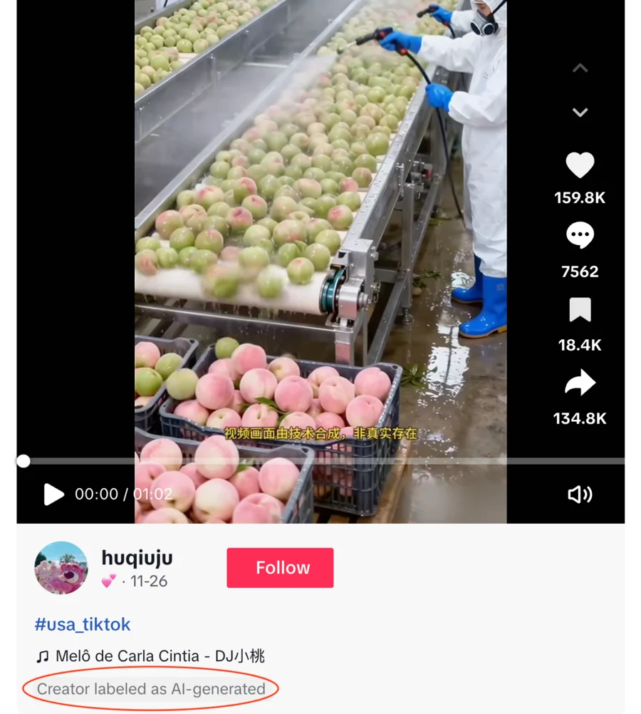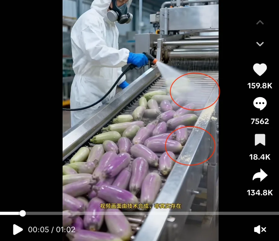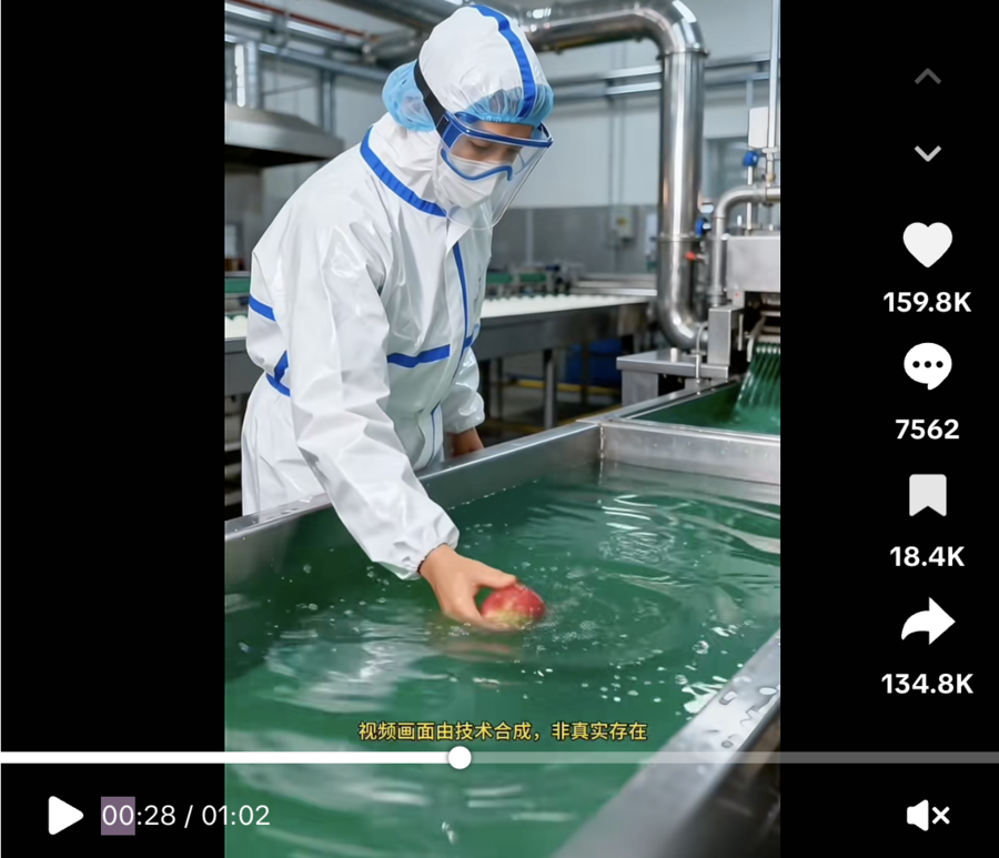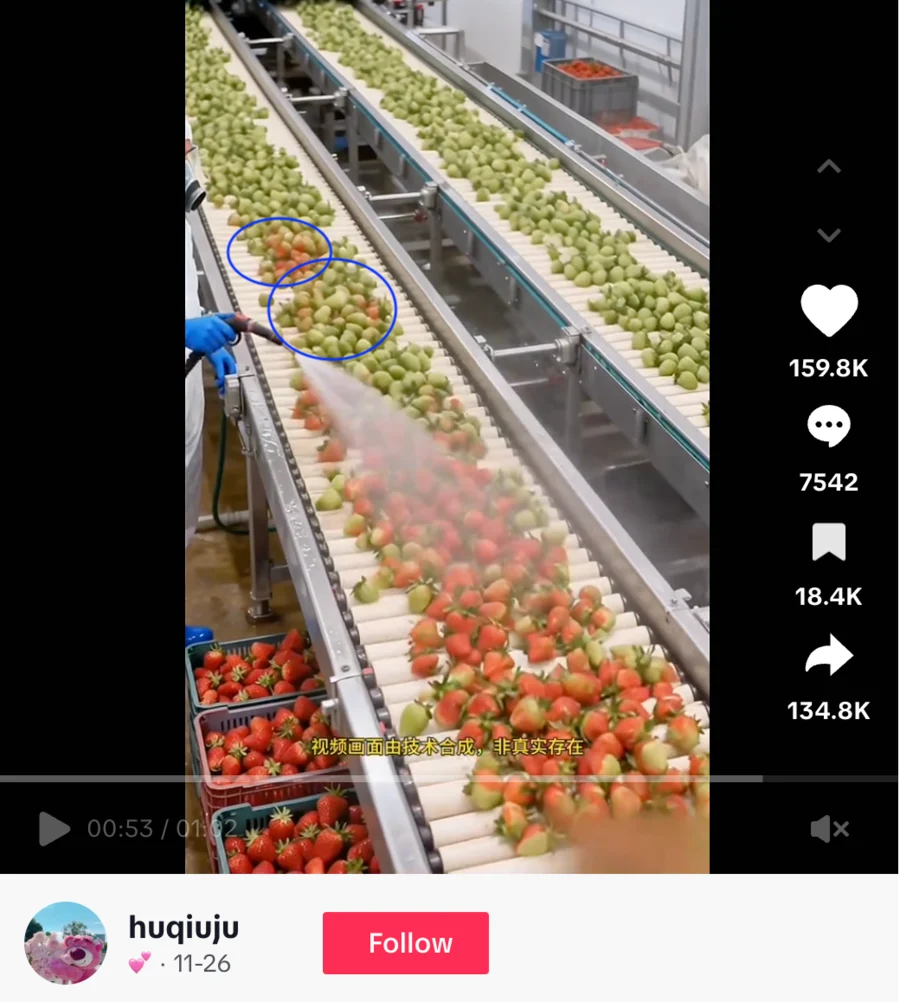 Një tregues parësor i kësaj është etiketa në cepin e majtë lart të videos ku shkruan “AI.” Mbishkrimi në gjuhën kineze në pjesën e poshtme të videos përkthehet në: “Pamjet video janë të kompozuara dixhitalisht dhe nuk ekzistojnë në realitet.”