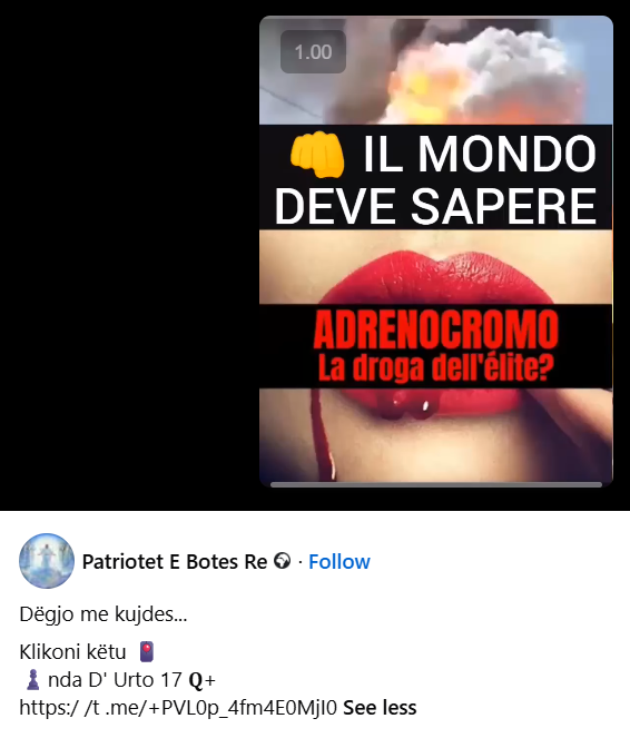Në rrjetet konspiracioniste, përfshi ato shqipfolëse, vijon të qarkullojnë teori mbi adrenokromin, “drogën e elitave” që përftohet nga gjaku i fëmijëve dhe përdoret nga personat e famshëm dhe të pushtetshëm. Postimi shoqërohet me një video të portretit të manipuluar të presidentit francez Macron dhe disa personazheve të tjera të njohura të politikës dhe artit, me shenja të errëta rreth syve, që pretendohet se është një pasojë e përdorimit të adrenokromit.
