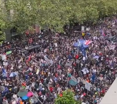 “Pamje të demonstratave masive në Melburn të shtunën (nëntor 2021), ku mijëra persona dolën për të protestuar ndaj bllokimeve të COVID dhe një projekt-ligj që do t’i jepte ekzekutivit fuqi të pacaktuara në raste emergjence – Protestat më të mëdha të Australisë ndër vite”-shkruhet krahas pamjeve të publikuara.