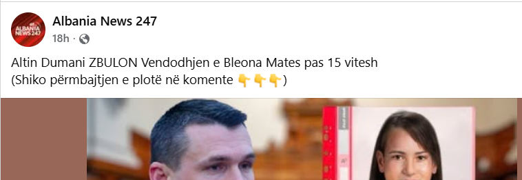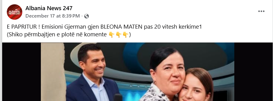 Dy postime të faqes Albania News 247 pretendojnë se e mitura Bleona Mata, e zhdukur në 22 maj 2010 në Kukës, është gjendur, ndërsa lexuesit ftohen të klikojnë një lidhje në komente për të mësuar më shumë. Megjithëse janë postuar brenda dy ditësh nga njëri-tjetri, postimet identifikojnë shpetimtarë të ndryshëm. Në postimin e 17 dhjetorit, pretendohet se Bleona Mata është gjetur nga një emision gjerman, ndërsa në atë të 18 dhjetorit, meritat i jepen kreut të Strukturës së Posaçme Kundër Korrupsionit dhe Krimit të Organizuar, Altin Dumani.