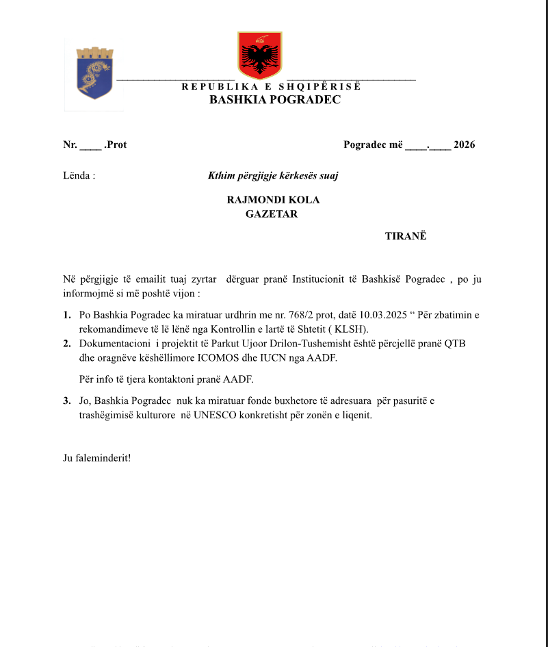 përgjigjen e saj, Bashkia shtoi se “dokumentacioni i projektit të Parkut Ujor Drilon–Tushemisht është përcjellë pranë Qendrës së Trashëgimisë Botërore (QTB) dhe organeve këshillimore ICOMOS dhe IUCN nga Fondacioni Shqiptaro-Amerikan i Zhvillimit (AADF)”.