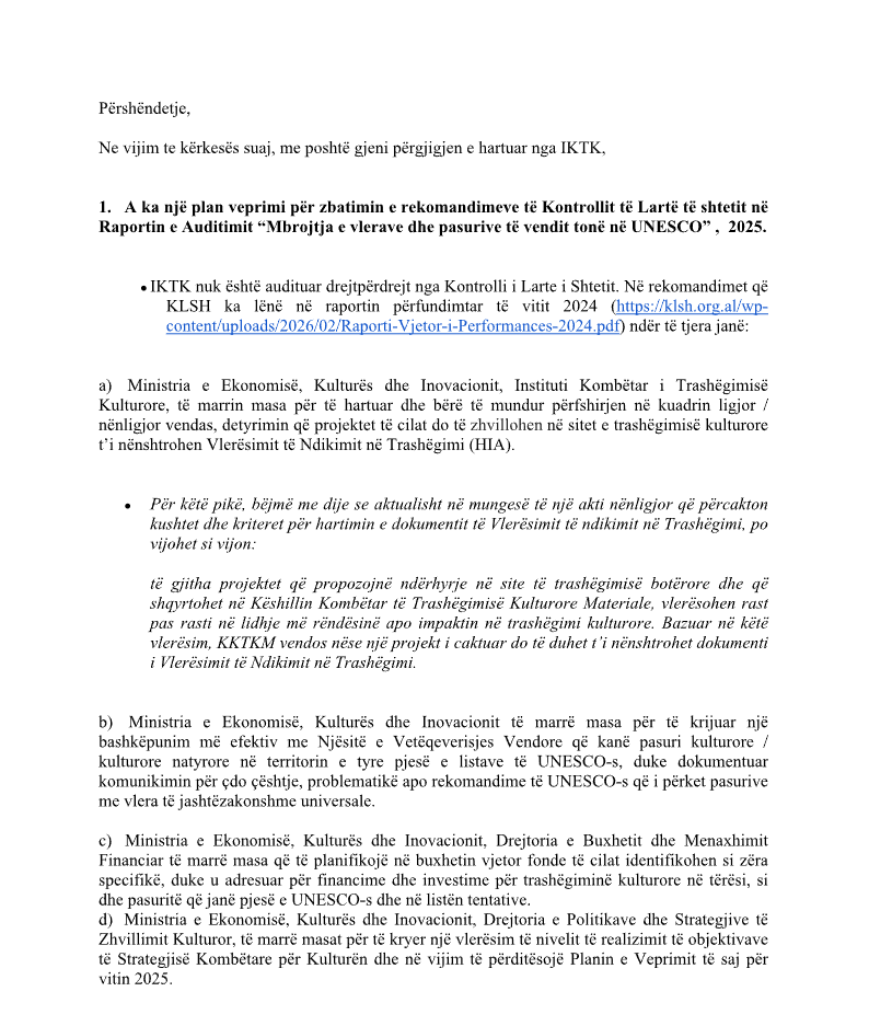 Në raport thuhet gjithashtu se “në buxhetin e ministrisë apo të bashkive që ishin objekt auditimi për periudhën 2020–2024 nuk rezultojnë të planifikuara fonde të posaçme për mbrojtjen e pasurive dhe vlerave të trashëgimisë kulturore të regjistruara në UNESCO, si dhe për pasuritë që ndodhen në listën tentative të organizatës”.