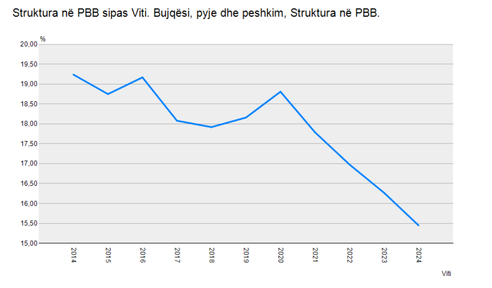 Deri në ndryshimin e kësaj skeme, fermerët do të vazhdojnë të vazhdojnë të shesin prodhimin e tyre më shtrenjt se importet. Dhe kjo ndodh në një kohë kur bujqësia është zyrtarisht në recesion. Pesha e bujqësisë në ekonomi ka rënë nga 19,24% në vitin 2014 në vetëm 15,45% në vitin 2024.
