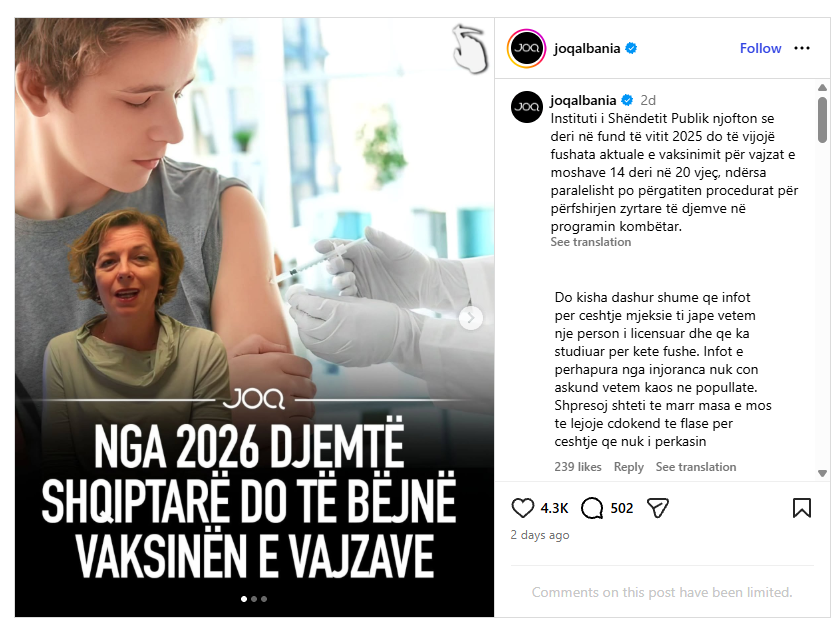 Një postim i portalit JOQ, që ka marrë mbi 4 mijë pëlqime në Instagram, lajmëron se nga viti 2026, “djemtë shqiptarë do të bëjnë vaksinën e vajzave.”