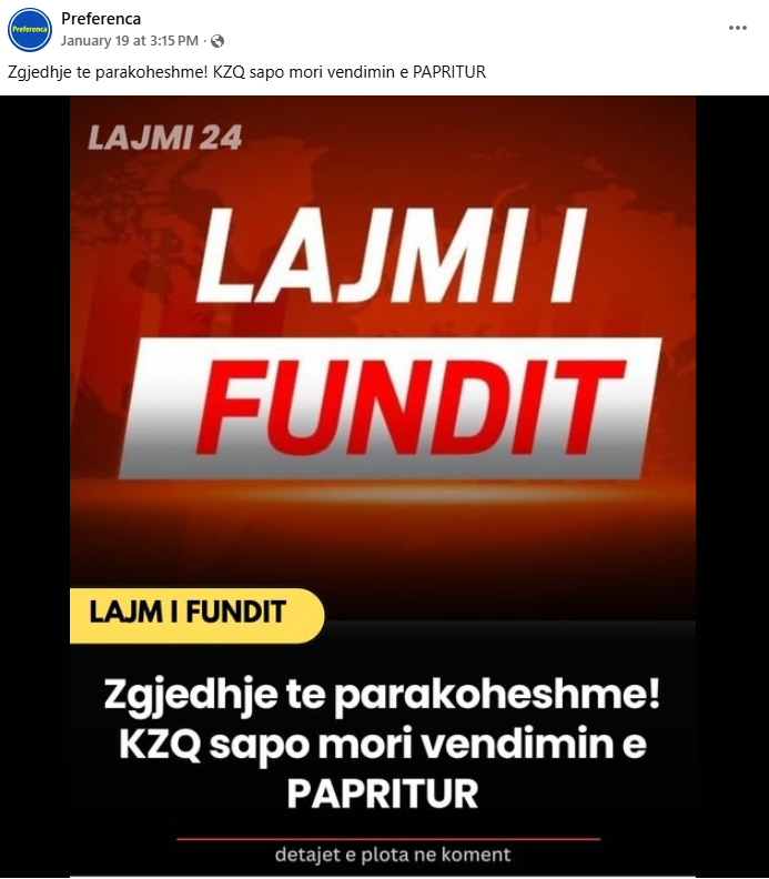 Një postim i 19 janarit në Facebook jep lajmin: “Zgjedhje të parakohshme! KZQ sapo mori vendimin e PAPRITUR”, ndërsa fton lexuesit të marrin vesh më shumë duke klikuar lidhjen në komente.