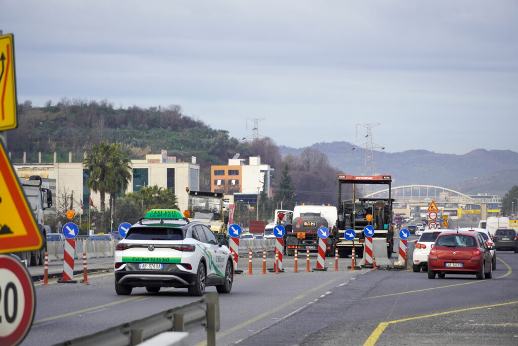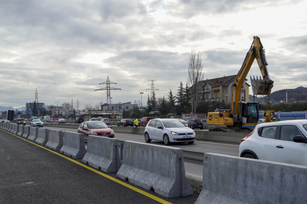 Fotot tregojnë gjendjen e zgjerimit të autostradës Tiranë–Durrës gjatë ditës së verifikimit nga Faktoje, më 15 janar. Në pamje dallohet se një pjesë e segmentit është ende në punime, me mjete ndërtimi aktive dhe zona të papërfunduara, ndërsa qarkullimi i automjeteve zhvillohet pjesërisht.